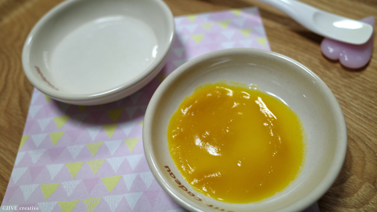 今日は「10倍粥」を小さじ4杯と「かぼちゃ(ポタージュ状)」を小さじ1杯です。
